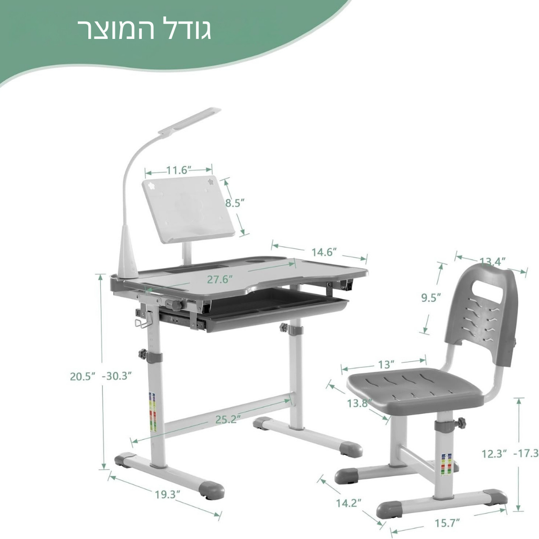 שולחן: רוחב 27.6 אינץ׳ × עומק 14.6 אינץ׳ × גובה מתכוונן 20.5–30.3 אינץ׳